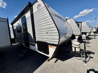 This single axle travel trailer is one you won't want to pass up! There is a front RV queen bed with a bedside shirt closet and overhead shelf for your things, and one more adult or two little ones can sleep on the booth dinette. A full kitchen includes a stainless two burner cooktop and microwave to cook meals each day, and the 12V black glass refrigerator will keep your food fresh. This model also includes a full rear bath with a toilet, sink, and 36" x 30" shower for easy cleaning up!