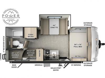 Sleeps 6 Slides 1 Length 21 ft 2 in Ext Width 7 ft 8 in Ext Height 10 ft 4 in Hitch Weight 501 lbs Dry Weight 3843 lbs Cargo Capacity 1155 lbs Fresh Water Capacity 31 gals Grey Water Capacity 27 gals Black Water Capacity 27 gals Furnace BTU 20000 btu Number Of Bunks 2 Available Beds Full Refrigerator Type 12V Convection Cooking Yes Cooktop Burners 3 Number of Awnings 1 LP Tank Capacity 20 lbs Water Heater Type Gas/Electric AC BTU 13500 btu TV Info 12V Smart TV Awning Info 14' Power Axle Count 1 Number of LP Tanks 2 Shower Type Tub/Shower Combo Similar Travel Trailer Floorplans