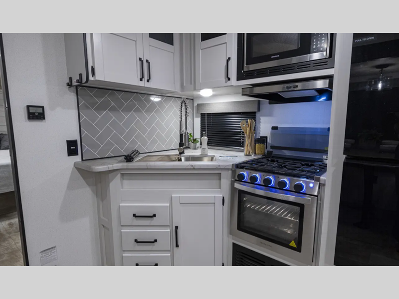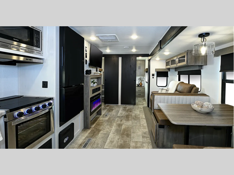 Sleeps 5 Slides 2 Length 34 ft 10 in Ext Width 8 ft Ext Height 11 ft 1 in Int Height 6 ft 8 in Interior Color Granite, Cafe Latte, Slate Hitch Weight 1020 lbs GVWR 9003 lbs Dry Weight 7503 lbs Cargo Capacity 1500 lbs Fresh Water Capacity 43 gals Grey Water Capacity 35 gals Black Water Capacity 35 gals Furnace BTU 35000 btu Available Beds Queen Refrigerator Type 12V Stainless Steel Refrigerator Size 11 cu ft Cooktop Burners 3 Shower Size 34" x 34" Number of Awnings 1 LP Tank Capacity 20 lbs Water Heater Capacity 6 gal Water Heater Type Gas/Electric AC BTU 13500 btu Awning Info 20' Electric with LED Lights Axle Count 2 Number of LP Tanks 2 Shower Type Shower w/Seat Similar Floorplans